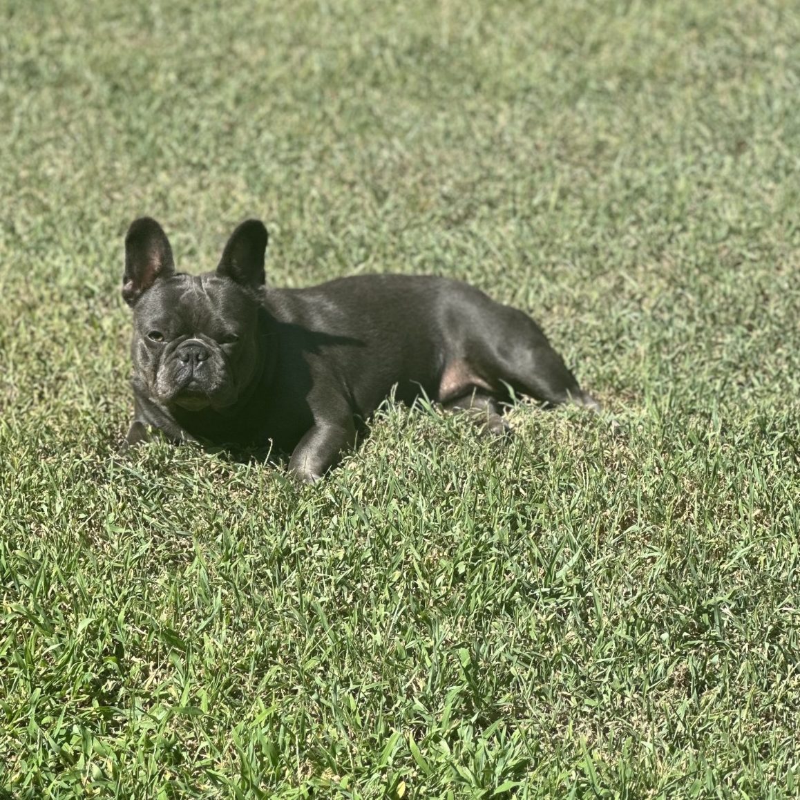 Cupcake is a Blue French Bulldog with an athletic structure. Cupcake is our largest French Bulldog at 22 pounds. With her athletic structure she loves to run and play all day. Cupcake is unlike any other French Bulldog, she was a guard dog in her past life and makes sure to let everyone in the house know. Cupcake has a genetic trait for low shedding with beautiful blue metallic colored coat.
