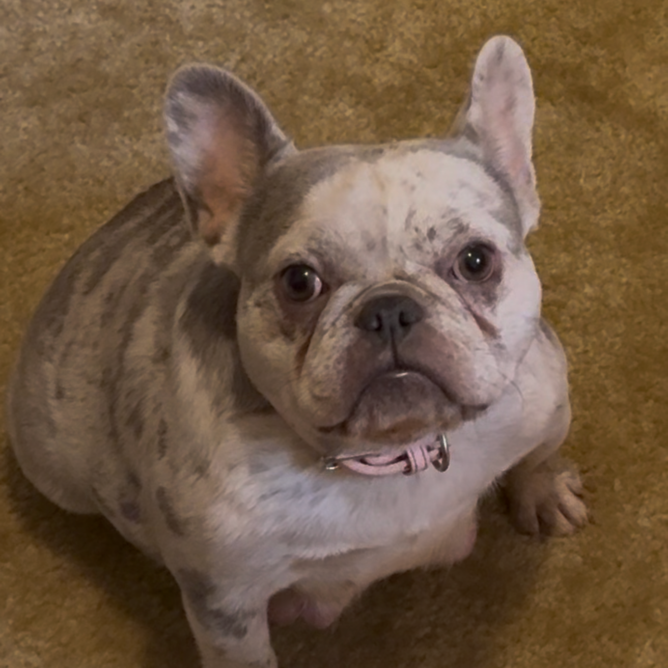 London is a Lilac Merle and Fluffy carrier female. Her beautiful coloring, small structure, and genetic makeup makes her the perfect Dame. London's genetic makeup and parental lineage is what makes London a show stopper. I adopted London when she was just 6 months old and she has been the best addition to my family. London has a contagious personality, sweet spirit, and is the calmest Frenchie out of the bunch.